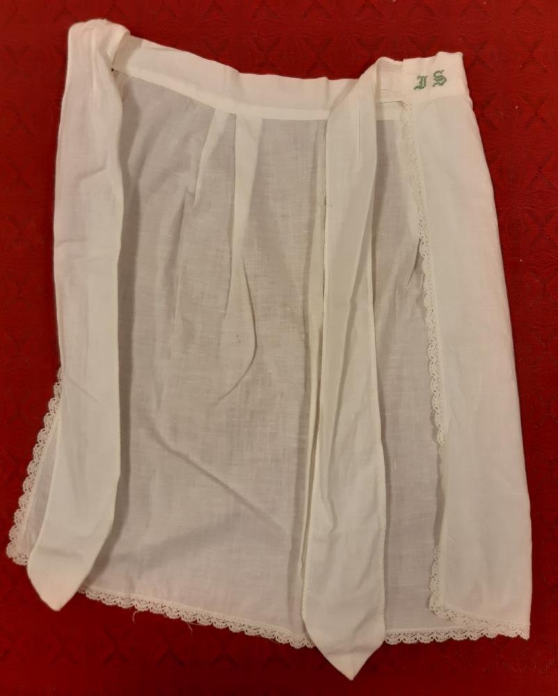 Hvít léreftssvunta. Hægra megin innan á streng er saumað með krosssaumi í grænu 'IS'. Blúnda í kring.