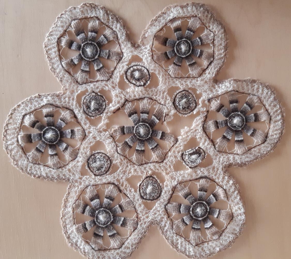 Tenerifaður smádúkur. Ein dúlla er í miðjunni og sex í sömu stærð festar við miðjudúlluna. Sex litlar dúllur festar á milli þeirra stóru. Brúnir náttúrulitir. Dúkurinn er frekar illa farinn.