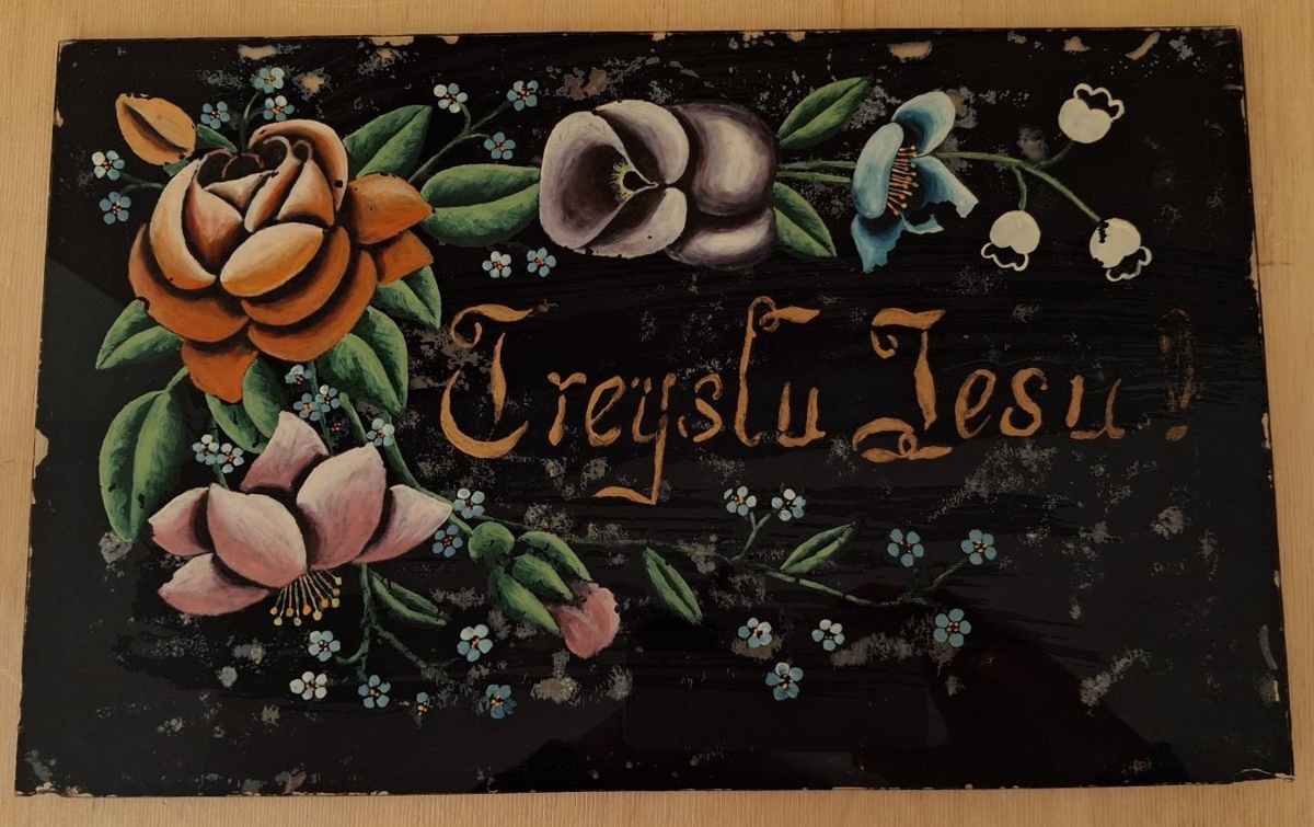 Mynd máluð á gler. Á hana er letrað "treystu Jesú" með gylltum stöfum á svartan grunn. Umhverfis eru málaðar rósir, bleikar, appelsínugular og fjólubláar með grænum blöðum. Aftan á er pappaspjald, á því eru kappmellaðar lykkjur til þess að binda snúruna í.