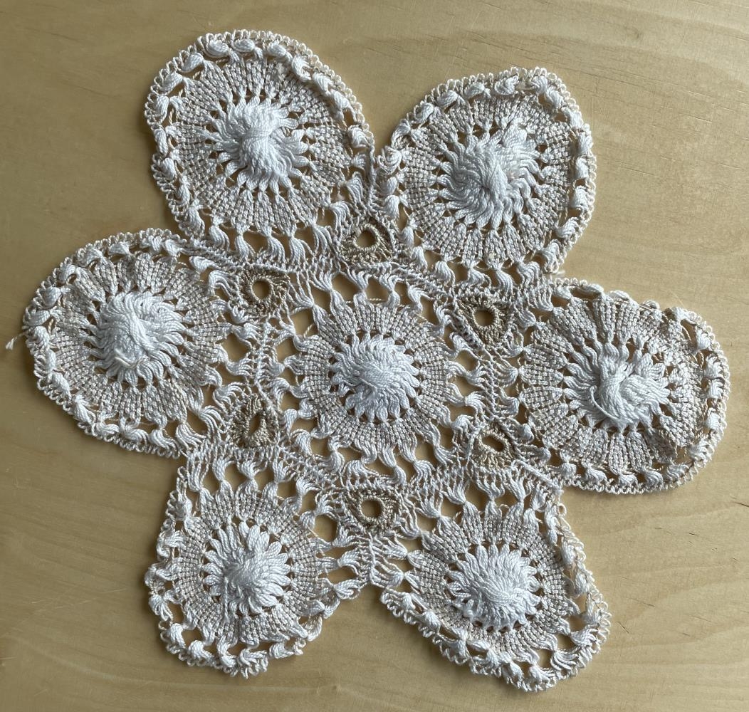 Hvítur og drapplitaður dúkur úr bómullargarni. Aðferð: Tenerife (Vilaflór) 5 dúllur utan um eina í miðju.