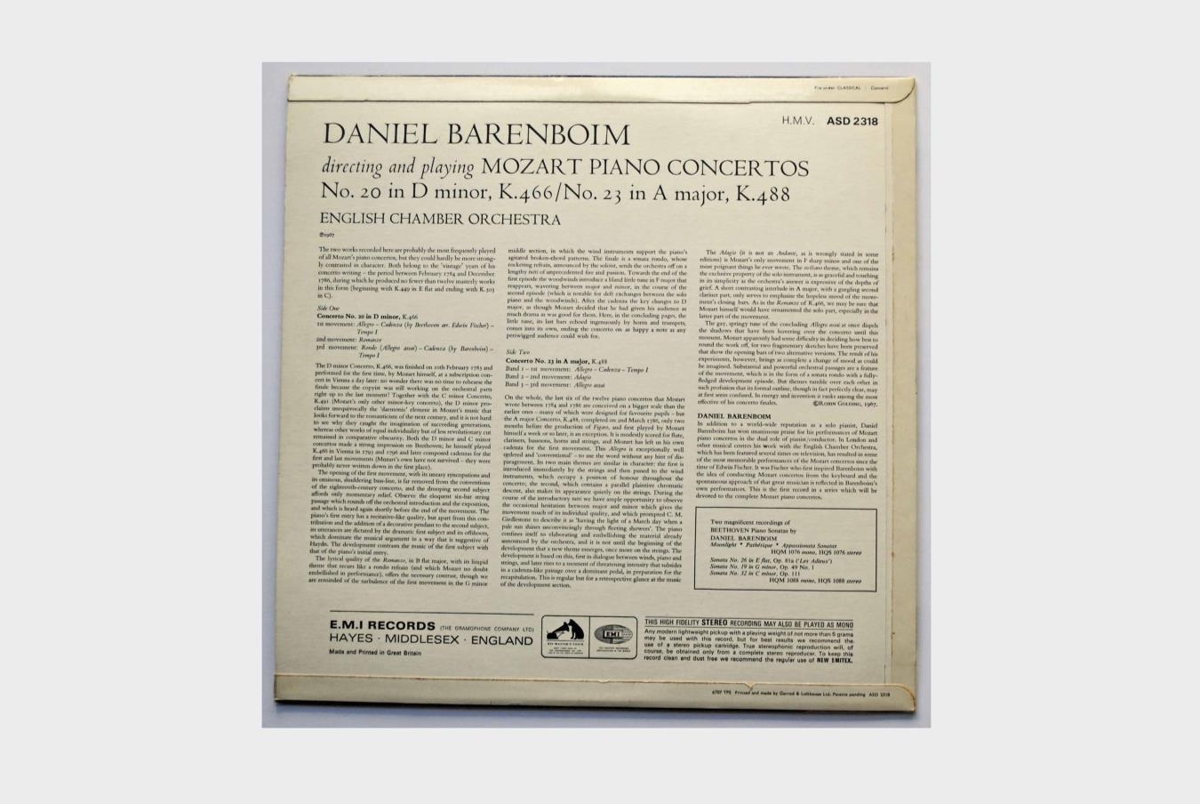 Píanóleikarinn Daniel Barenboim leikur tvo píanókonserta eftir Mozart. Nr. 20 í D-moll K.466 og nr. 23 í A-moll K. 488.