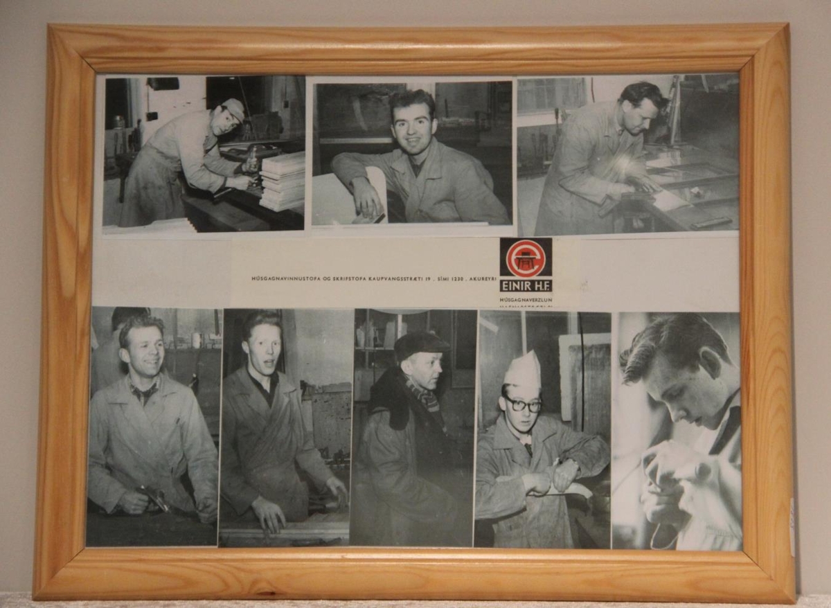 Þetta er áttamynda safn undir gleri í fururamma. Texti: Húsgagnavinnustofa og skrifstofa Kaupvangsstræti 19. Sími: 1230. Akureyri. Einir hf. Húsgagnaverslun. Vörumerkið er svart með rauðri og hvítri teikningu. Myndirnar eru svart-hvítar. Fyrir miðri mynd að neðan er forstjórinn, Jón Oddsson, úlpuklæddur.