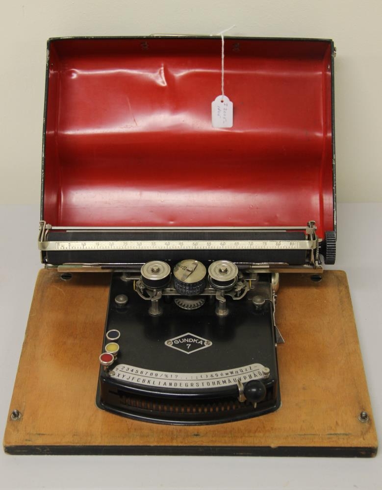 Vélin er svört að lit með svartan texta á silfruðum málmi. Texti á vél: Gund Ka. Vélin situr á eikarplötu og henni fylgir svart lok. "Þetta þykir ólíkindavél", eða þannig var henni lýst fyrir safnstjóra (Jóni Arnþórssyni) af starfsmanni í viðgerðadeild Pennans. Texti í gjafabréfi dagsettu 30. apríl 2004: "Með bréfi þessu vilja ættingjar og vinir systkinanna, sem lengi bjuggu í Baldurshaga, afhenda Iðnaðarsafninu ritvél af gerðinni Gund Ka 7 til varðveislu. Systkinin hétu Jónína, Baldur, Hulda, Guðrún og Barði Benedikts. F. h. ættingja og vina, Þorsteinn Arnórsson.