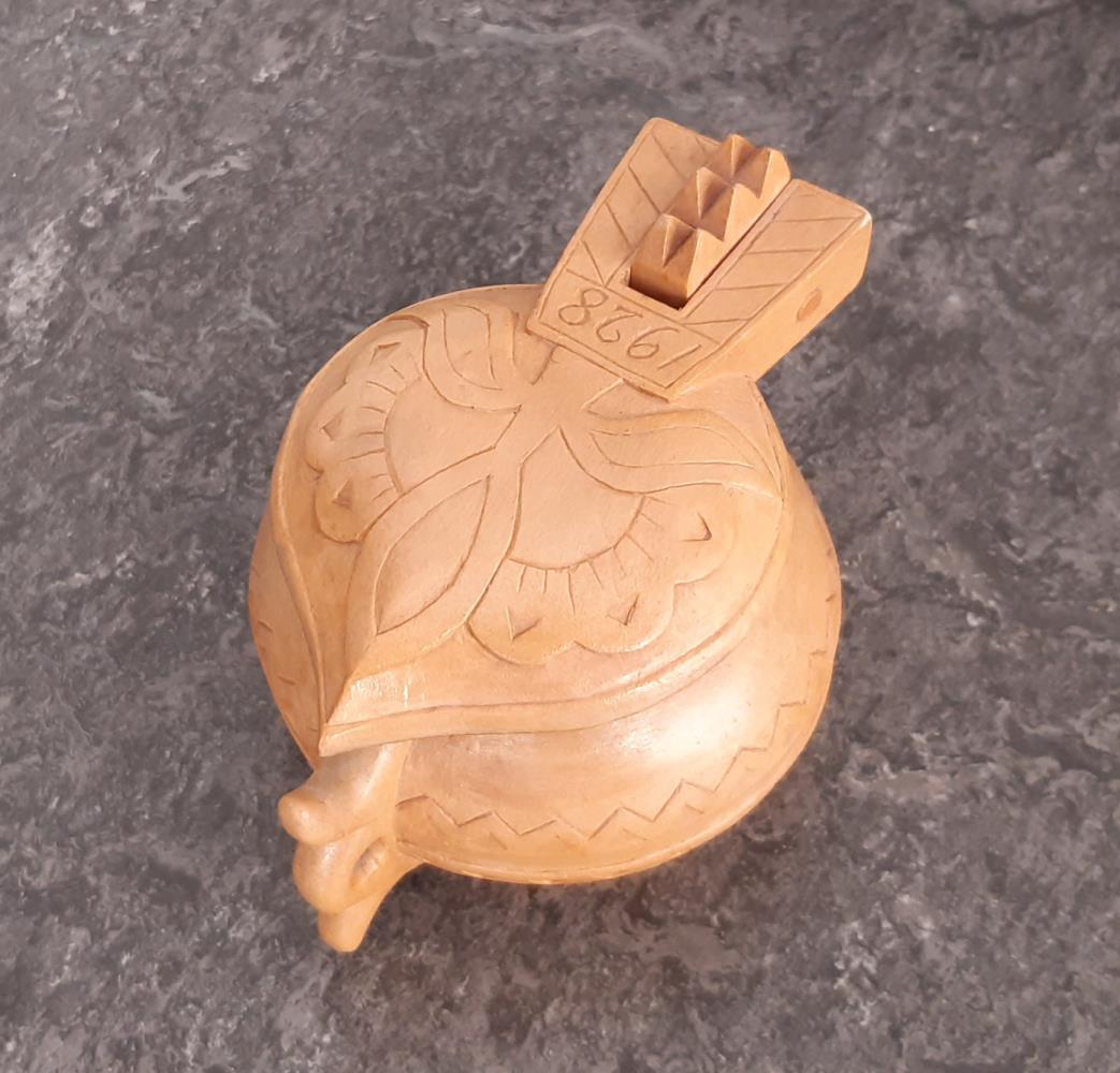 Askur - b) Lítill útskorinn askur. Ártalið 1912 skorið í hann. Askinn gerði Kristján S. Sigurðsson, trémeistari frá Akureyri