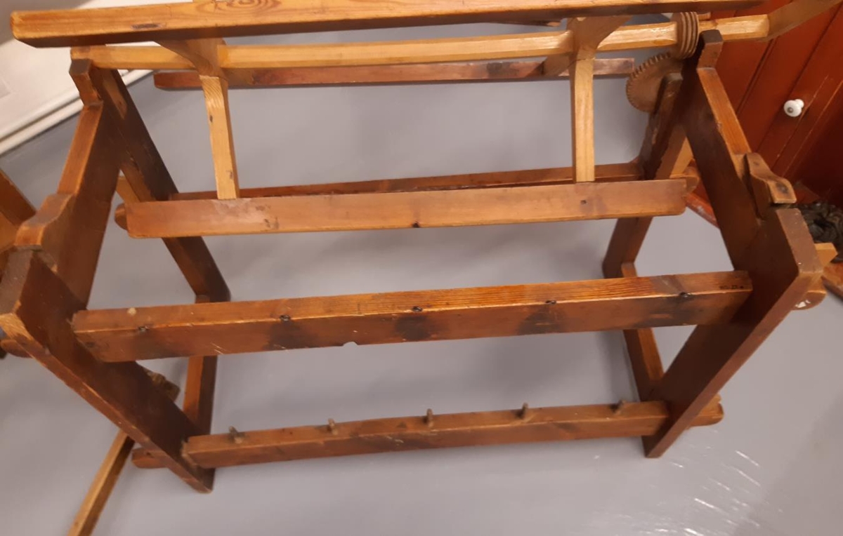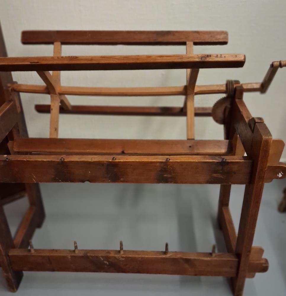 Hesputré sem hægt er að búa til fimm hespur í einu á. Áhaldakassi úr viði. Í honum er: halasnælda, margar spólur og naglbýtur, það er allt óskráð.