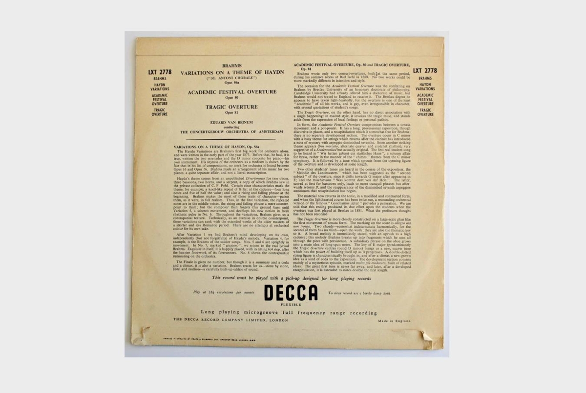 Eduard van Beinum stjórnar The Concertgebouw Orchestra of Amsterdam í flutningi á Variations on a Theme of Haydn opus 56a, Academic Festival Overture opus 81 og Tragic Overture opus 81 eftir Johannes Brahms.