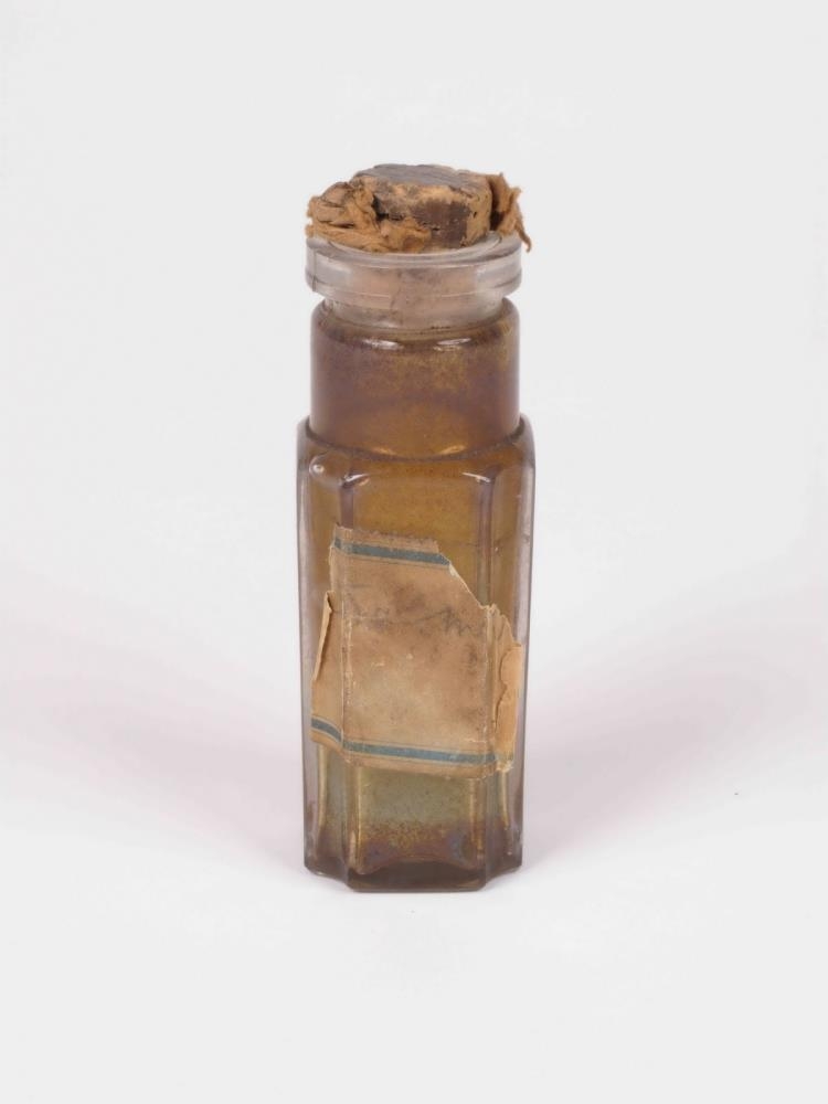 Stútvíð flaska úr litlausu gleri, en nú brúnleit af innihaldinu. Innanmál stúts: 2.2 cm, hann er með 0.7 cm þykkum kraga aðgreindur með skoru frá hinum hluta stúts. Flaskan er áttstrend og á botni hennar stendur: 263 og mun þar um að ræða: Talmoniogram, sbr. Lauritz blandt andre, Næstved museum, Liv og Levn 1-1987, bls. 32. Á glasinu eru slitrur af merkimiða, en ekki verður greint hvað á honum stendur. Í því er dálítið af svart-gljáandi dufti sem Þórður notaði til blývatnsgerðar til að ná út mars. Í stútnum er korktappi.