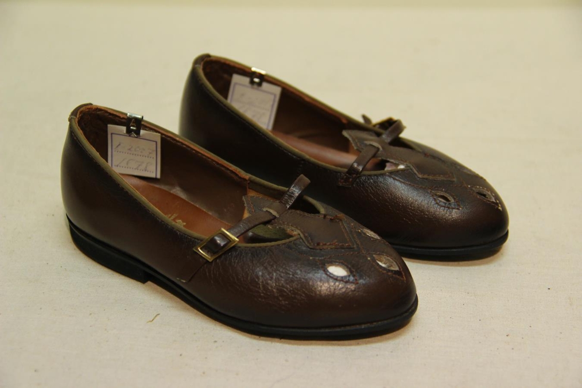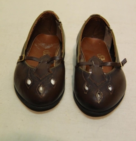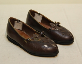 Telpuskór, brúnir að lit. Munstur á tá og festing með ristarbandi. Merking: Iðunn. Stærð: 2. Fyrir 2-3 ára.