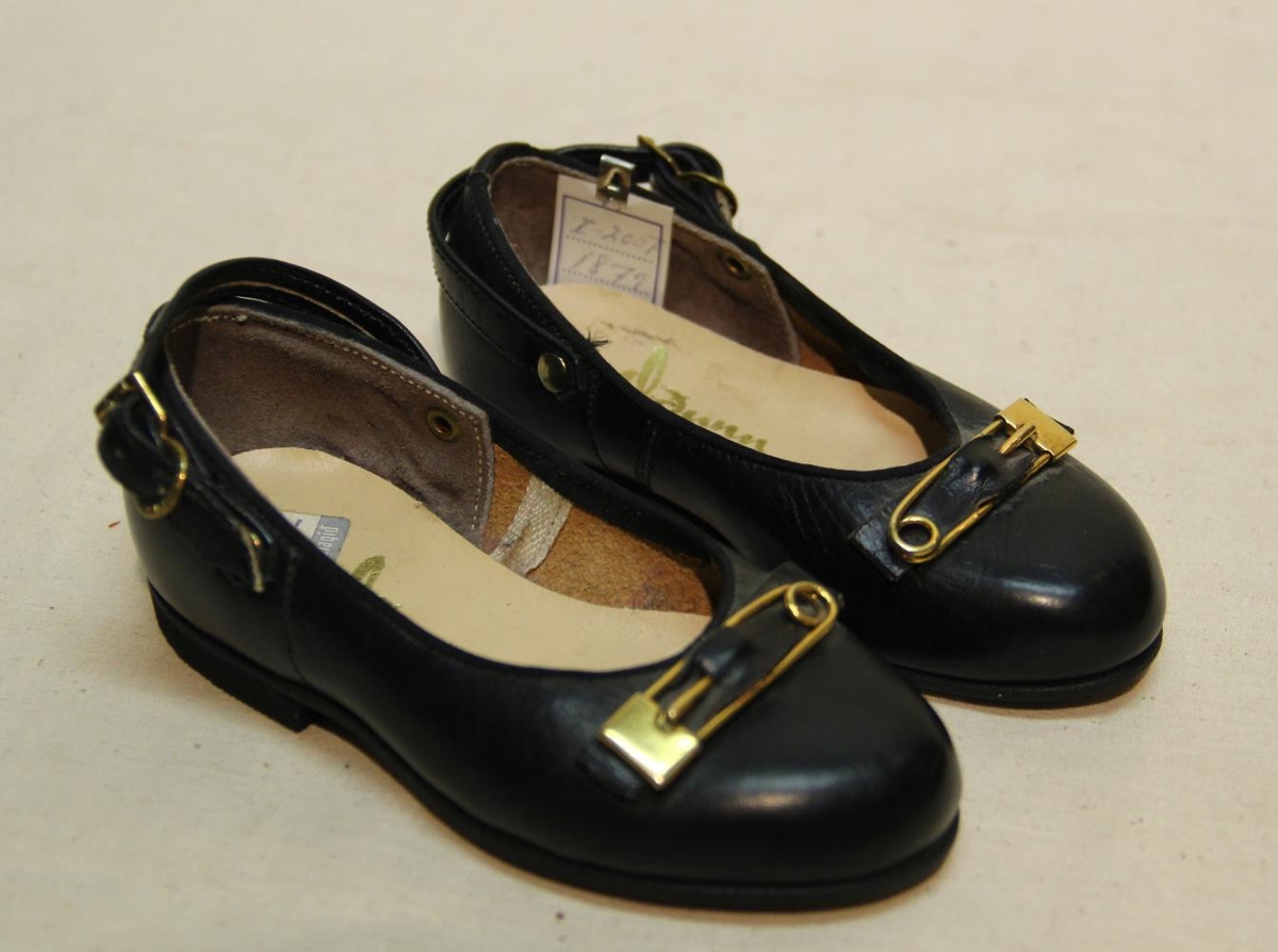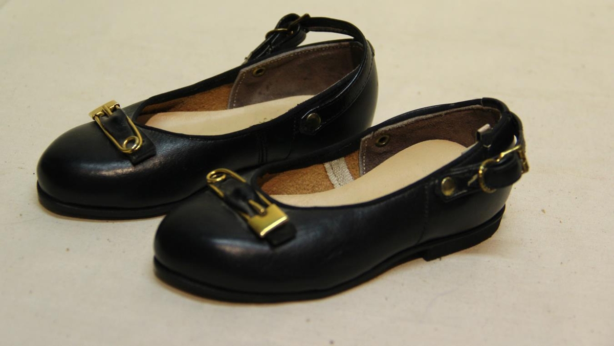 Telpuskór, svartir að lit með gylltri spennu á tá. Festing með ristarbandi. Merking: Iðunn. Stærð: 2. Fyrir 2-3 ára.