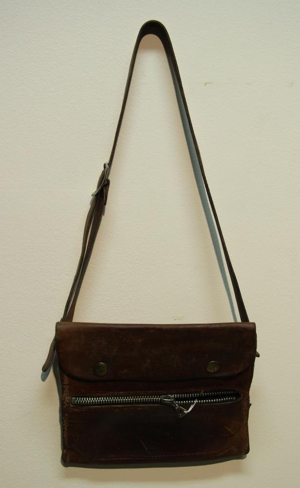 Taskan er úr brúnu leðri með smelltu stærra hólfi en minna hólfi lokað með rennilás. Axlaband er 90 cm. og með spennu úr stáli.