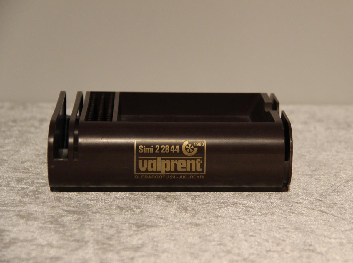 Kassinn er skráður á Iðnaðarsafninu á Akureyri sem skrifstofukassi. Hann er brúnn að lit, ætlaður fyrir minnismiða og annað smælki úr skrifstofuhaldi. Texti með gulum lit: Valprent - Sími 22844 - Glerárgötu 24, Akureyri.