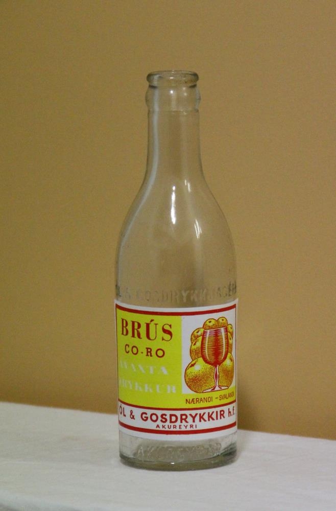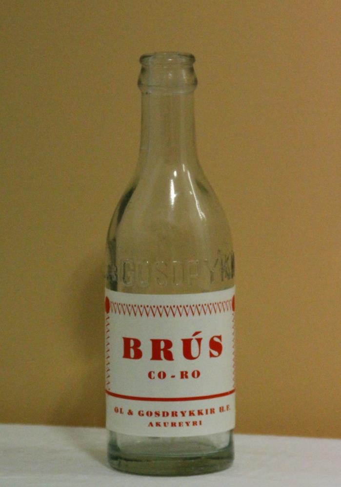 Flöskurnar eru jafnstórar. Í annarri er upphleypt gler með texta: Öl og gosdrykkir (með stórum stöfum). Hin flaskan er með smærra letri: Öl og gosdrykkjagerð Akureyrar. Texti á álímdum miðum: Brús - co-ro.