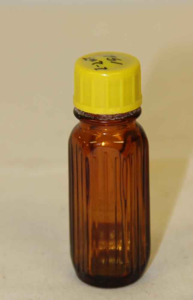 Flaskan er úr brúnu gleri og er með gulum plasttappa. Texti á álímdum miða: Akureyrar apótek - O.C. Thorarensen - Joðáburður - Varúð, geymist þar sem börn ná ekki til. Flaskan er 8,5 cm. á hæð og 3 cm. í þvermál.