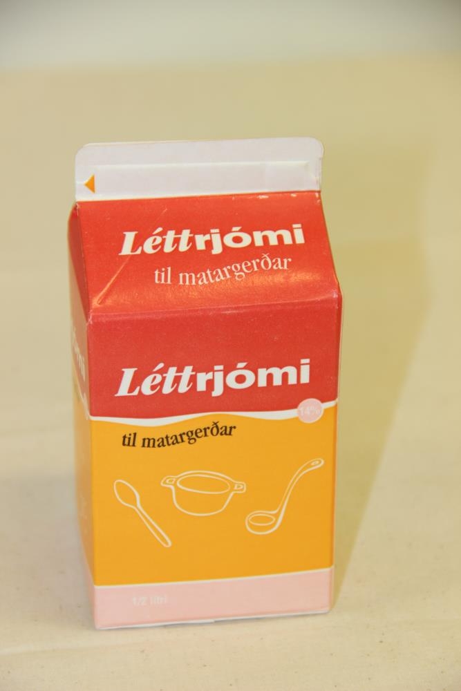 Fernan er undan léttrjóma. Hún er rauð og gul og tekur 0,5 lítra. Texti: Norðurmjólk - og leiðbeiningar um matargerð. Framleiðandi umbúða er Elopak.
