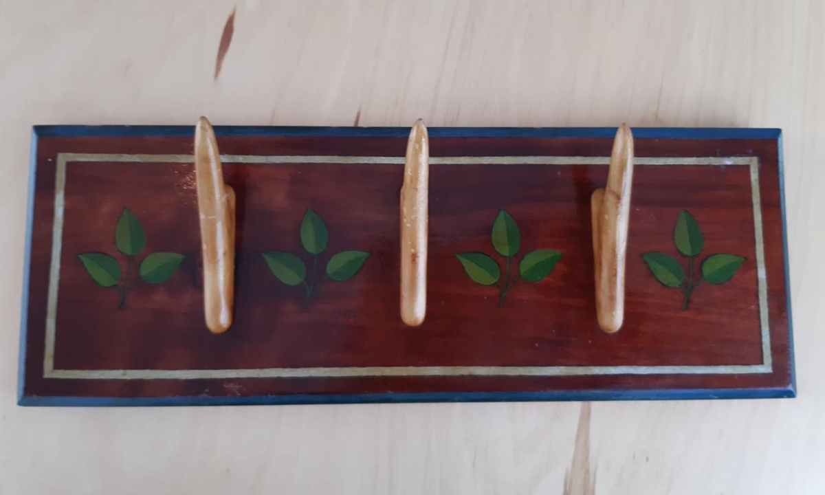 Hengi - Tréhengi/snagar úr birki með þrem uglum. Grunnurinn málaður brúnn en örmjó gul rönd sem myndar ramma. Græn laufblöð á 4 stöðum, til endanna og á milli ugla.