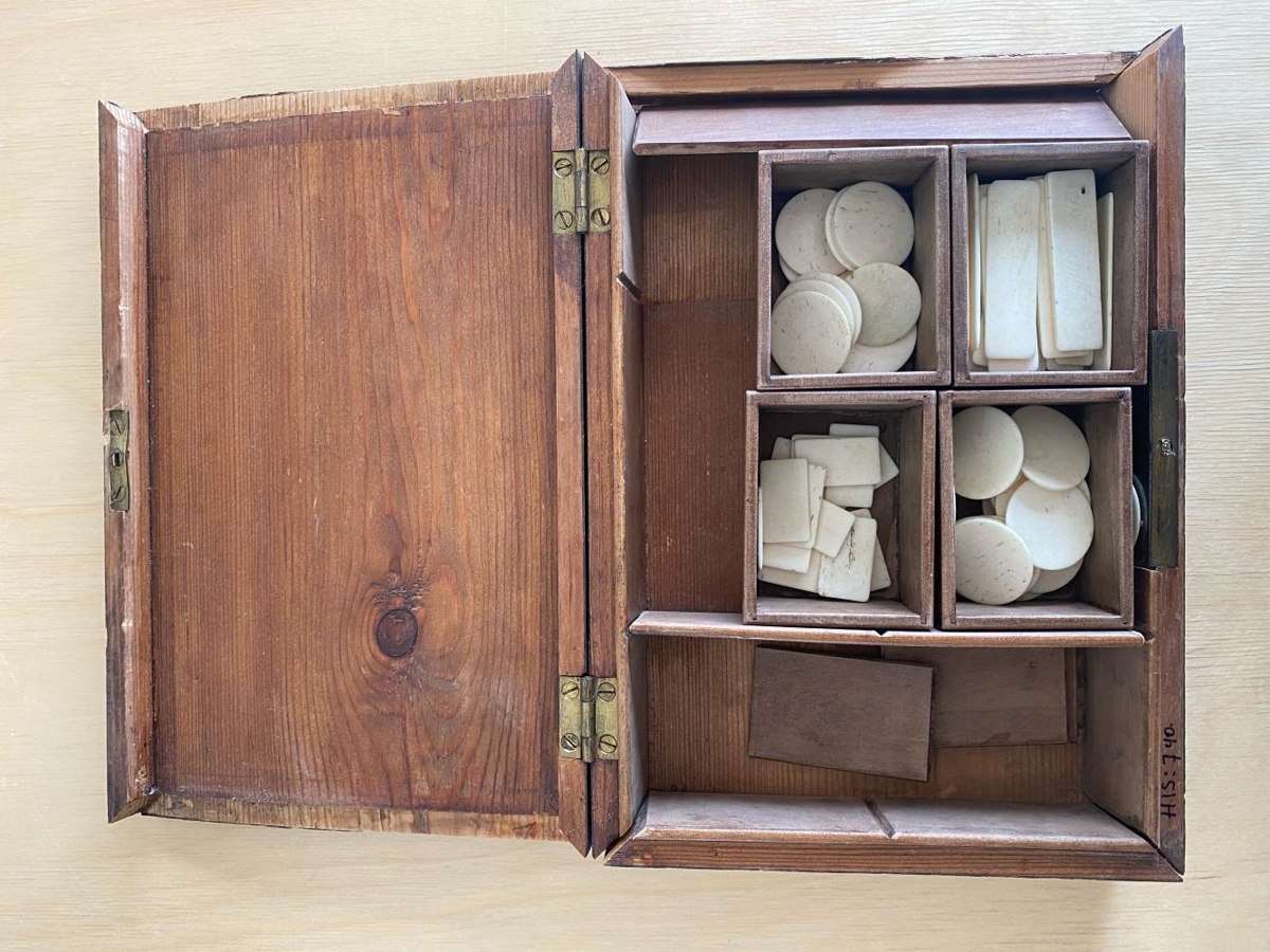Kassi a,b,c,d,e - Kassi með fimm hólfum. Er úr furu og spónlagður með eik. Illa farinn, dottinn í sundur. Kassanum fylgja fjórir 7x5 cm kassar. Í þeim eru beinplötur sem notaðar voru við spilamennsku. A: Kassi með fimm hólfum. B: Kassi með 16 plötum 3x1,5 cm. C: Kassi með 32 plötum 5,2x1,5 cm. D: Kassi með 20 kringlóttum plötum, 3 cm í þvermál. E: Kassi með 15 plötum 3x3 cm breiðum. - Saga: Jónas faðir Þorbjargar smíðaði kassann um aldamótin.