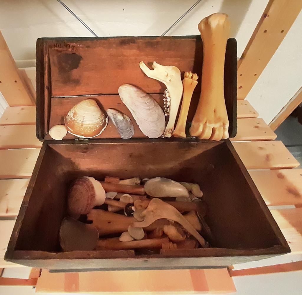 Kistill - Blár viðarkistill með kúptu loki. Málning er máð. - Saga: Ósk var dóttir Skarphéðins. Í kistlinum eru leggir og margt fleira frá Jófríði í Haga. Leggir voru leikföng áður fyrr.