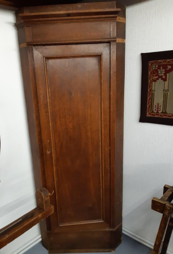 Brúnn hornskápur úr viði. Listar efst og á hurð. Trélamir, lykilinn vantar. Í kassa í skápnum eru kúlulappir. Þrjár hillur.