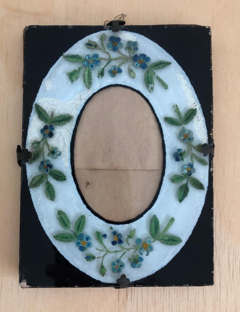 Rammi - Málaður glerrammi með svörtum grunni og ljósbláum sporöskjulöguðum kanti í kringum gatið. Á kantinum eru blá smáblóm með grænum blöðum. - Saga: Margrét þorkelsdóttir var fötluð, hafði fengið berkla í bak. Hún skar glerið og málaði í rúmi sínu. Helga Friðriksdóttir fékk rammann að gjöf frá henni árið 1926. Helga og Sigþrúður Friðriksdætur voru systur.
