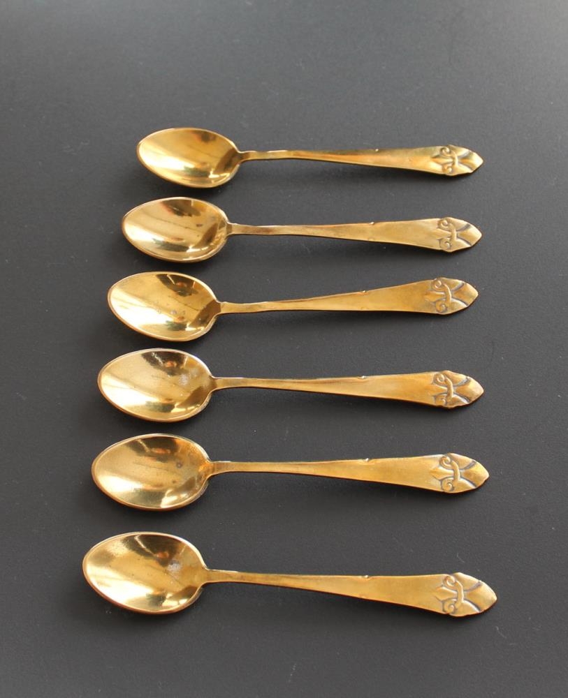 Skeiðar a,b,c,d,e,f. Sex gylltar tveggja turna silfurskeiðar, teskeiðar. Samtals á þessu númeri eru tíu teskeiðar úr silfri. Sex gylltar og fjórar silfraðar. Allar eru þær með eins liljumunstri.