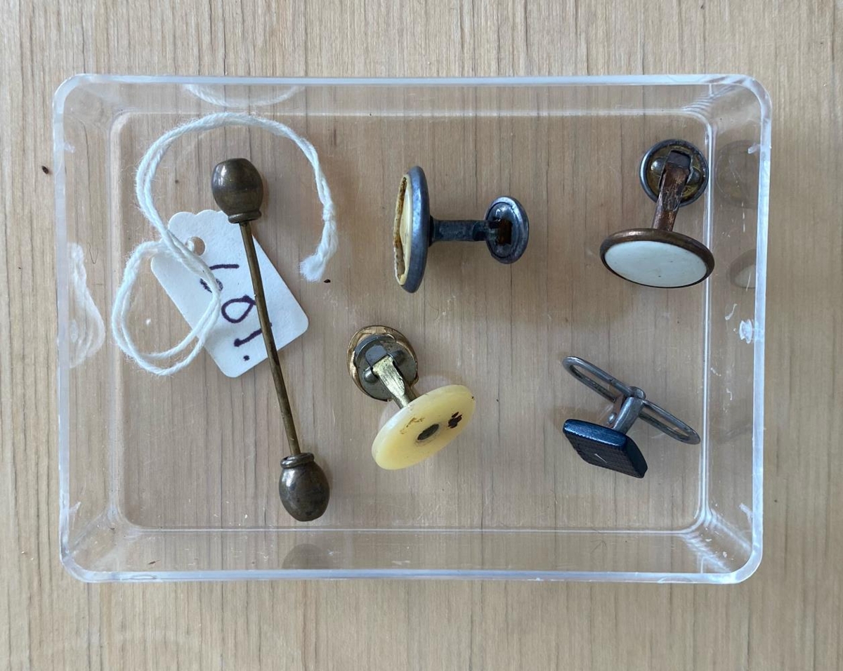 Flibbahnappar og flibbaprjónn a,b,c,d,e - Fjórir mismunandi glibbahnappar og einn flibbaprjónn. Geymt saman í plastdós. - Saga: Úr búi Kristjáns Blöndal að Gilsstöðum í Vatnsdal. Kristján var faðir Magnúsar Blöndal.