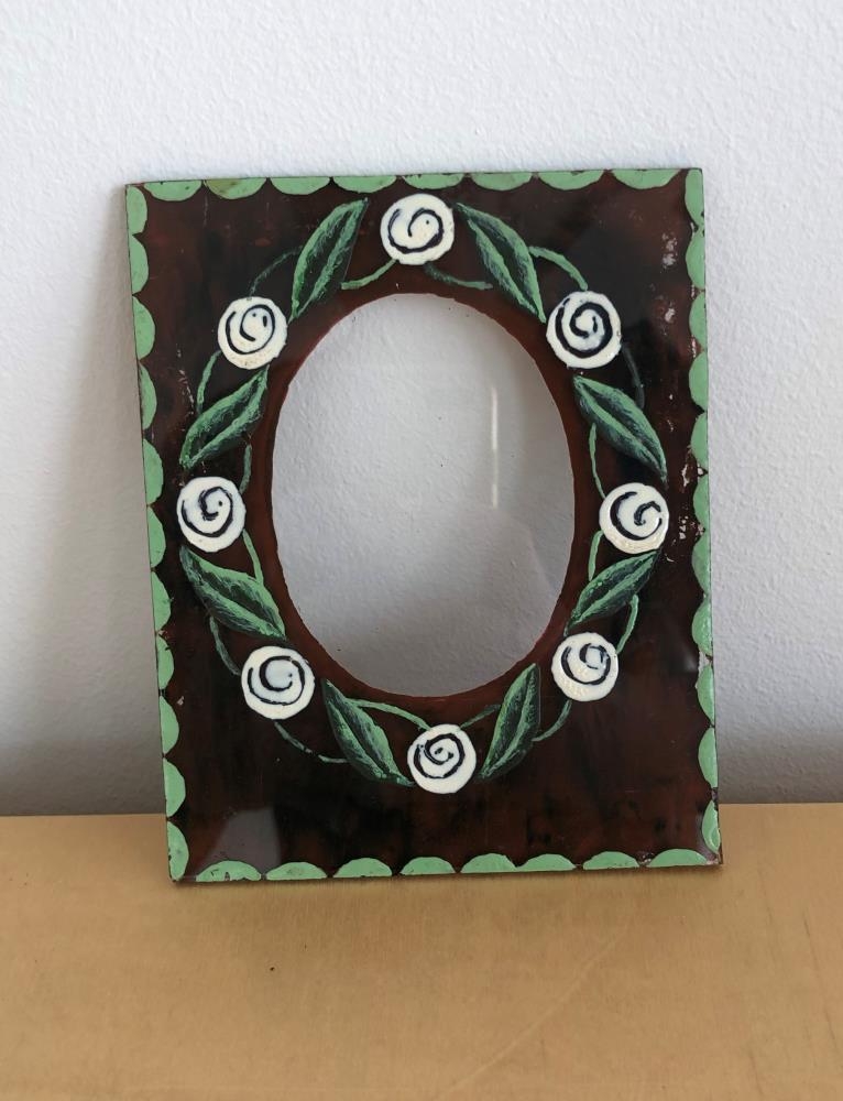 Myndarammi úr gleri, málaður fyrir sporöskjulagaða mynd. Grunnlitur er brúnn. Auk þess eru í rammanum hvít og græn laufblöð og hringir. - Saga: Margrét Þorkelsdóttir var fötluð, hafði fengið berkla í bak. Skar glerið og málaði í rúmi sínu.