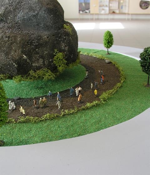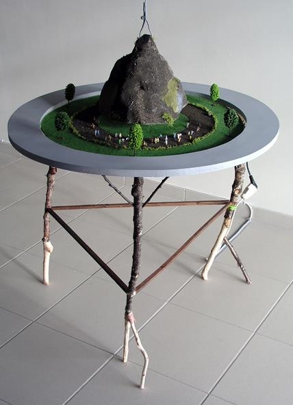 Kringlótt borðplata sem stendur á kræklóttum birkifótum. Á borðplötunni er gróður og fólk sem snýst umhverfis fjall sem hangir yfir borðplötunni.