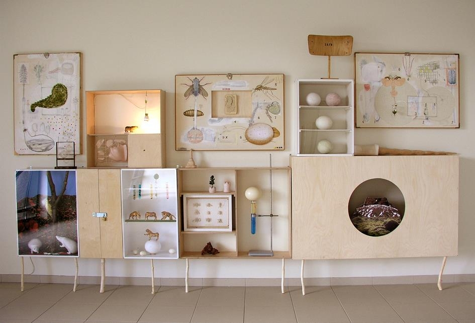 Olga has an alter ego called Dr. B, who is a scientist. In her reimaging of a specimen collection, the artist considers the selection and arrangement of specimens that might find their way into a natural history museum of the future, after the revolutionary changes underway in the fields of genetics and biotechnology. Some specimens are found objects – either altered by the artist or left intact. There are allusions to both mythical beasts and hybridized animals. One cabinet is securely closed with a padlock, arousing the viewer’s curiosity. We are left asking what is it that needs to be kept out of sight.