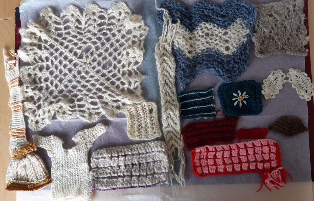 Nokkrar hekl- og prjónaprufur í mismunandi litum.