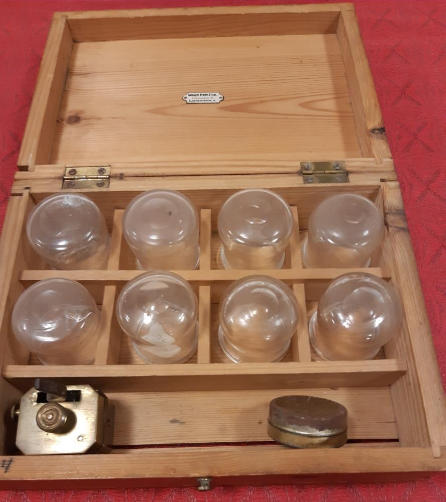 Blóðtökutæki. Bíldur úr kopar og átta glerkoppar í trékassa. Kassanum hefur upphaflega fylgt gaslampi en hann er ekki lengur til staðar. Á merki á loki kassans stendur "GAMILLUS NYROPS ETABL" Kjöbmagergade 43. Kjöbenhavn K. Ofan á lokinu er koparhalda og framan á er koparkrókur til þess að loka kassanum.