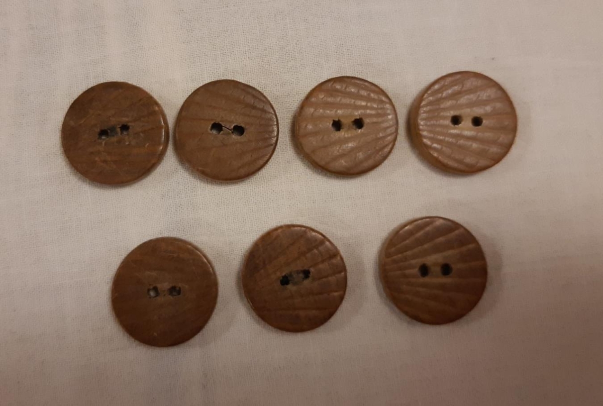 Sjö tölur úr viði, A-G. Tölurnar eru með tveimur götum og renndar með Hörpuskeljamunstri.