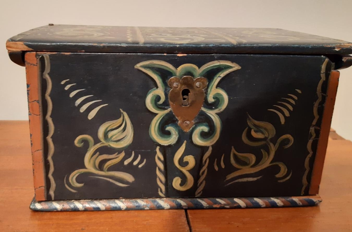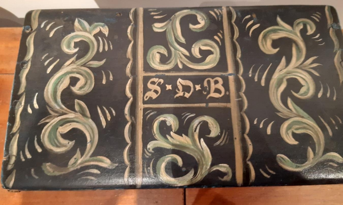 Kistillinn úr viði (furu), málaður með dökkrænum lit. Á loki og framhlið eru blóm máluð með ljósgrænum og hvítum litum. Stafirnir S.O.B. eru málaðir á lokið. Kistillinn er rauðmálaður að innan. Hægri hliðin er laus. Þegar hún er dregin upp kemur leynihólf í ljós.