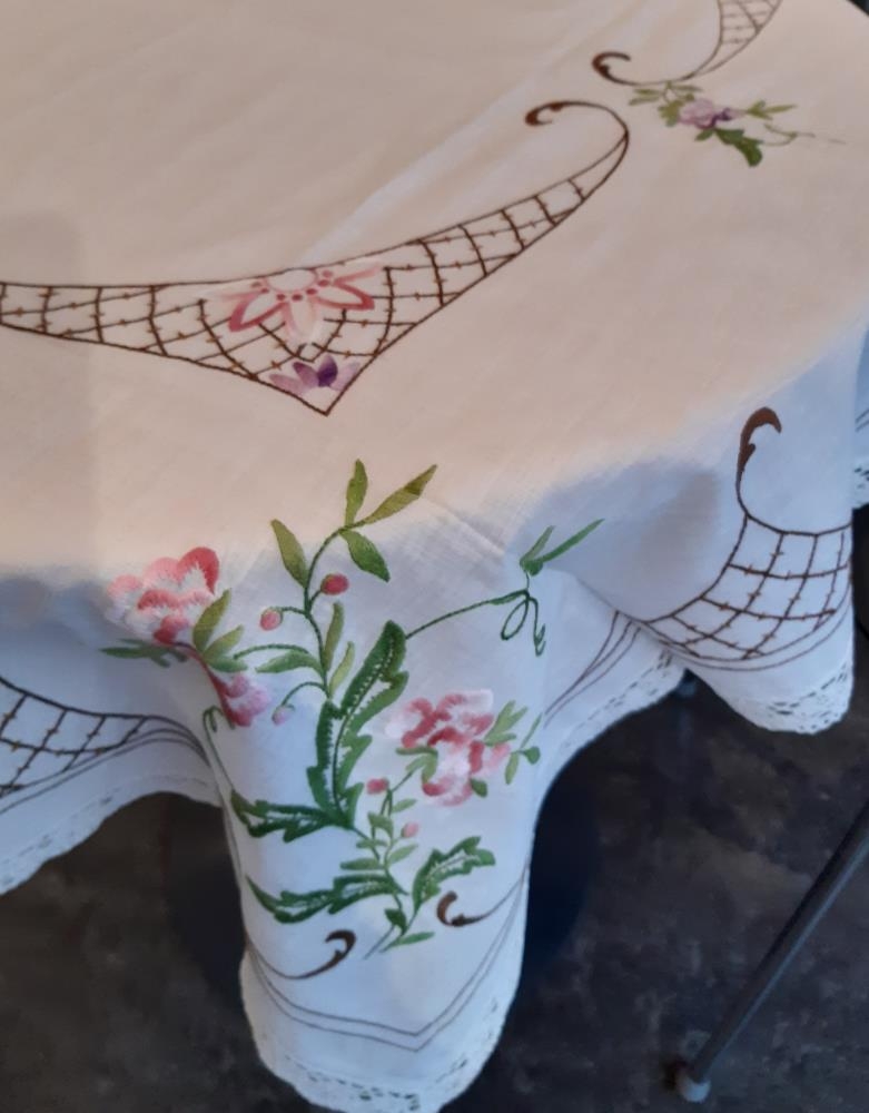 Kaffidúkur - Undurþunnt bómullarléreft. Útsaumað m/flatsaum og kontorsting. Keypt blúnda. Litir: dökkbrúnt, ljósbrúnt, bleikur, lillablár, tveir grænir litir.