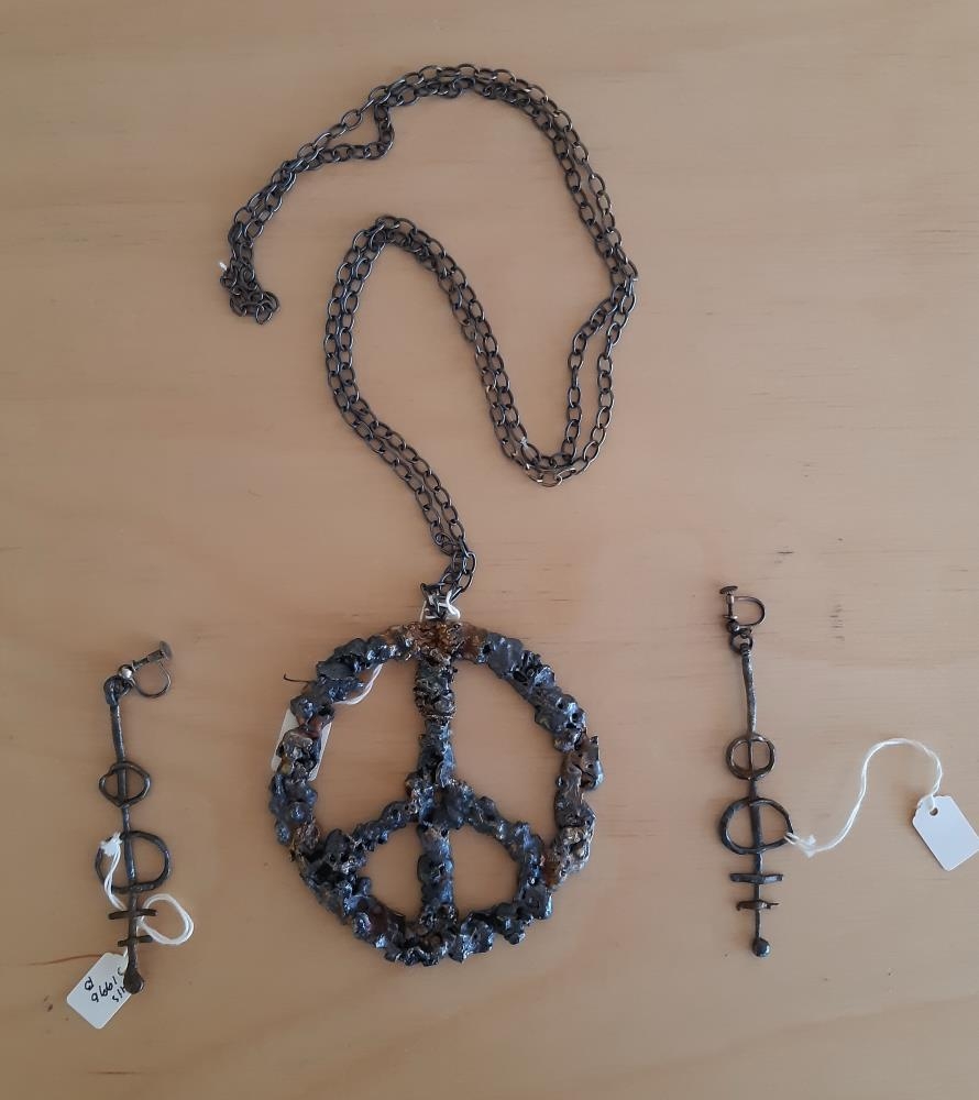 Hálsmen - Stór hringur með friðarmerkinu hangir í grófri keðju. - Saga: Sigríður keypti eða lét smíða þetta skart til að bera við kvöldkápu sem hún hannaði og saumaði og hefur áður gefið til safnsins - nr. 1699.