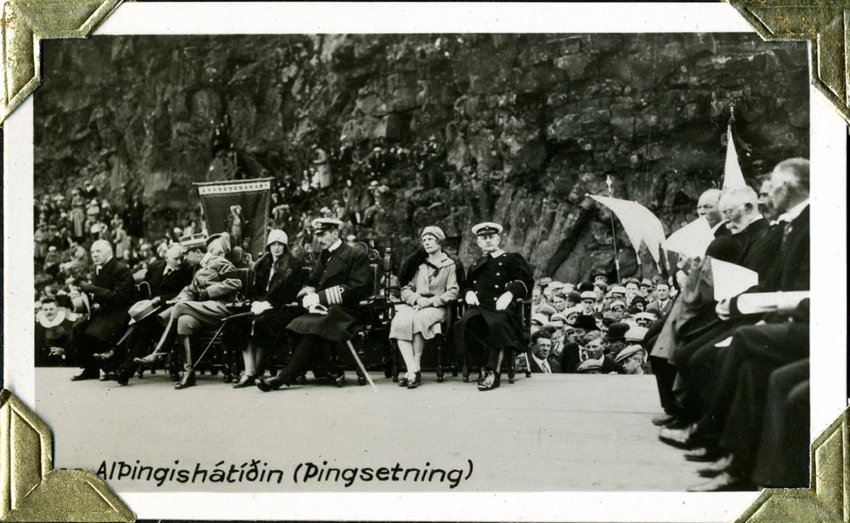 Frá Alþingishátíðinni á Þingvöllum 1930. Danakonungur, drottning hans og fleiri fyrirmenni við setningu þingsins. Áritað á mynd: 22. Alþingishátíðin (Þingsetning).