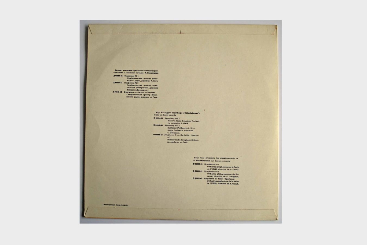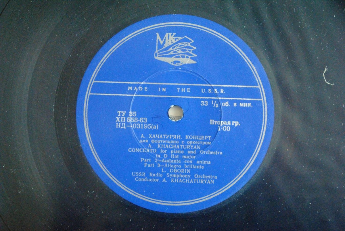 Konsert fyrir píanó og hljómsveit í Des-dúr eftir Aram Khachaturian í flutningi píanóleikarans Lev Oborin og Útvarpshljómsveitar Sovétríkjanna undir stjórn Khachaturian sjálfs. Platan er í bláa hljómplötukassanum.