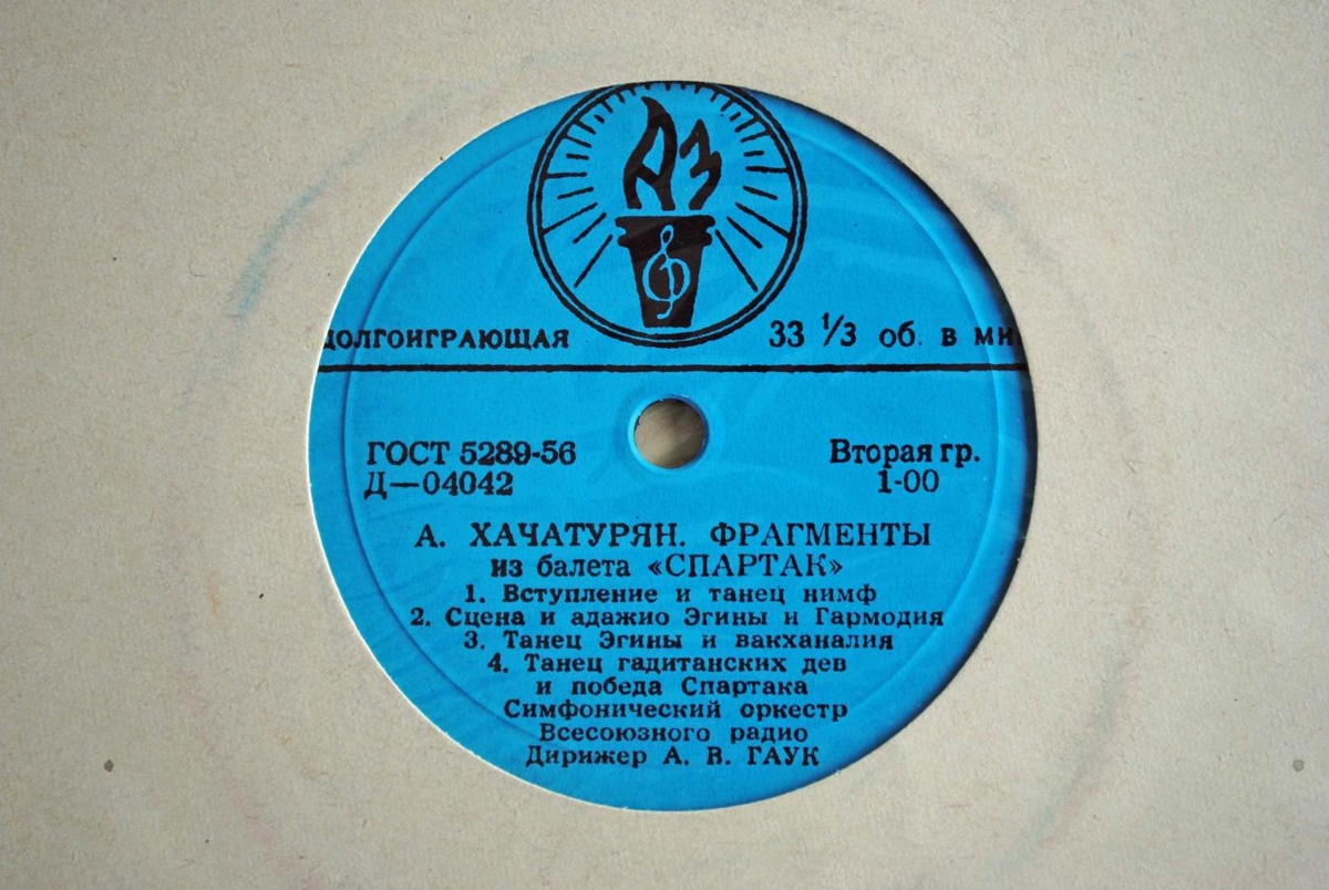 Brot úr balletinum Spartakus eftir Aram Khachaturian í flutningi Útvarpshljómsveitar Sovétríkjanna undir stjórn Alexandr Gauk. Allar upplýsingar á plötunni eru á rússnesku. Platan er í bláa hljómplötukassanum.