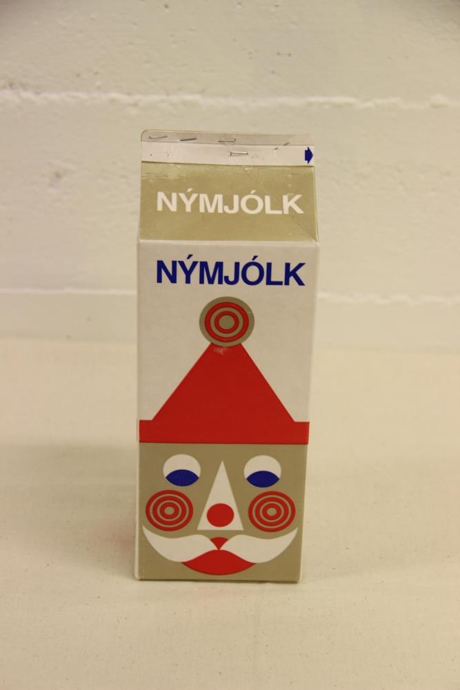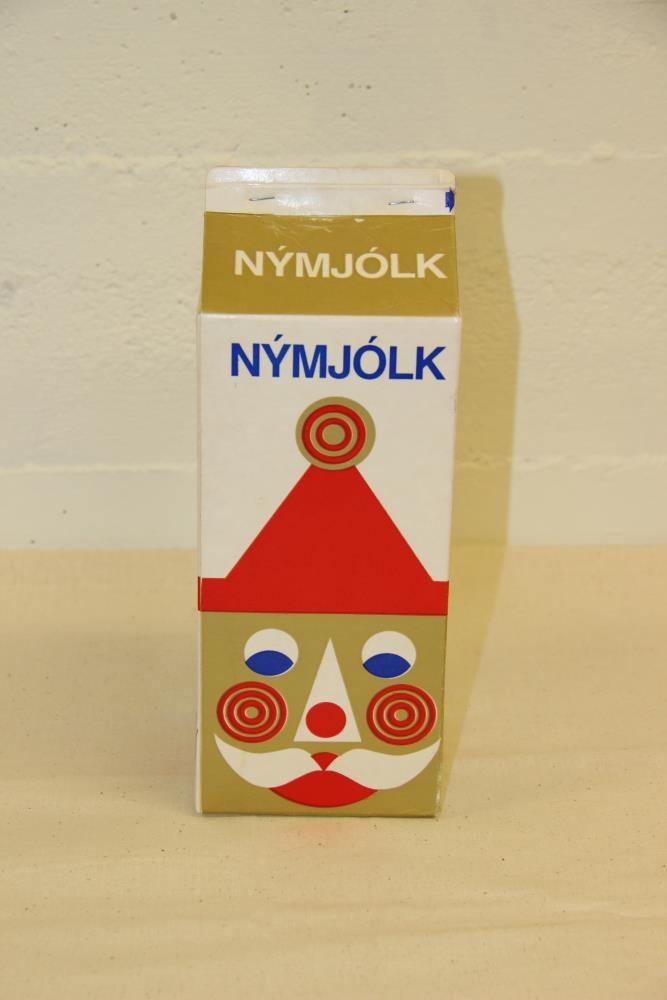Jólaútgáfa að tveggja lítra mjólkurfernum. Hún er í rauðum, hvítum og gylltum litum.