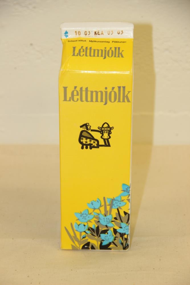 Fernan er gul með ljósbrúnu letri. Texti: Léttmjólk - Auðhumlumerkið - mynd af bláum blómum - og innihaldslýsing. Stærð: Fyrir 1 lítra.