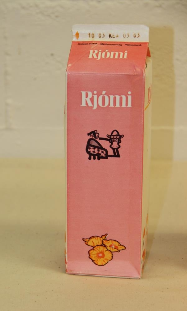 Fernan er rauð/bleik með hvítu letri og gulum blómum. Texti: Rjómi - Auðhumlumerkið - ásamt upplýsingum um pökkunardag og síðasta neysludag. Stærð: Fyrir 1 lítra.