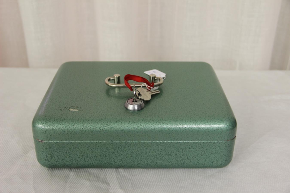 Kassinn er grænn að lit með tveimur lyklum. Lyklarnir eru merktir: "Döblina 35/513". Þessi peningakassi er úr dánarbúi Aðalbjargar Jakobsdóttur.