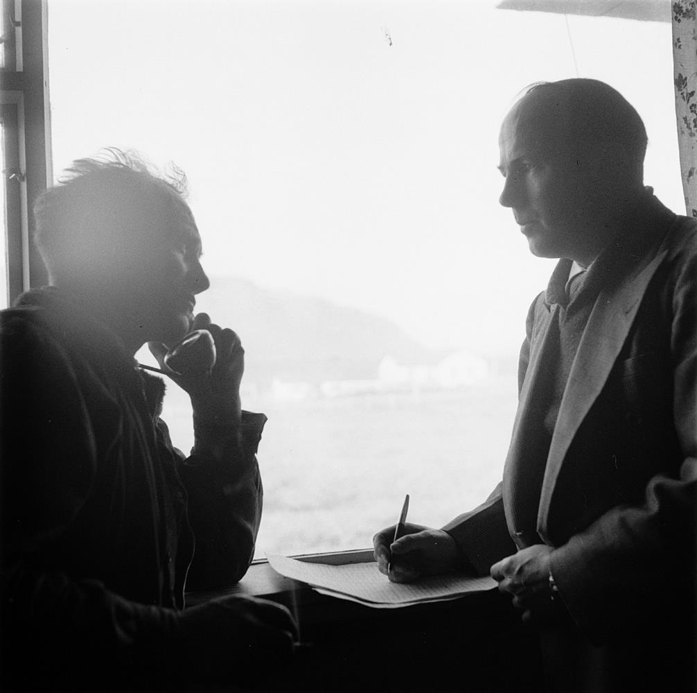 Selfoss. Tveir menn sitja við glugga, annar talar í síma en hinn fylgist með. Vigfús Guðmundsson og Hjalti Gestsson ráðunautur. Fjárflutningar 1952. Sjá Tíminn 2. október 1952.