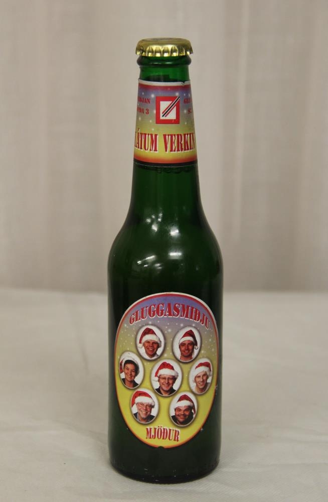 Græn glerflaska með gylltum tappa með Víking-merkinu. Sérmerktur bjór: Myndir af sjö mönnum með jólasveinahúfur - auk þes að vera merkt Gluggasmiðjunni Mjöð - Alkóhól 4,5 %. Stærð: 330 ml.