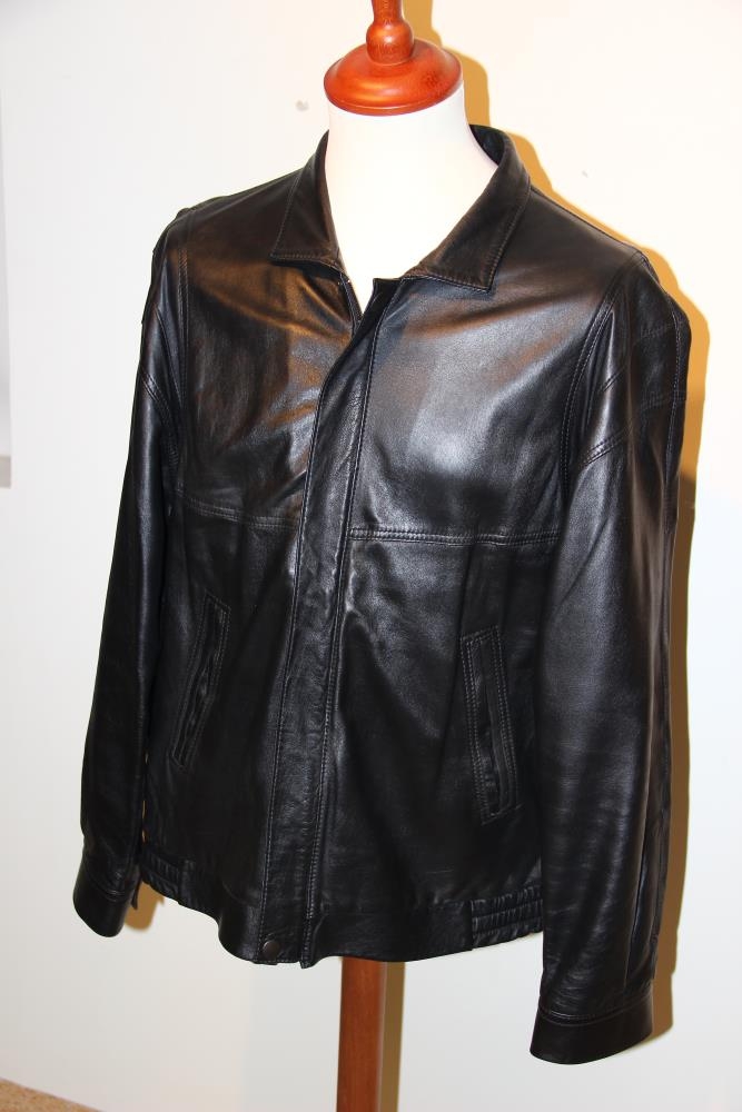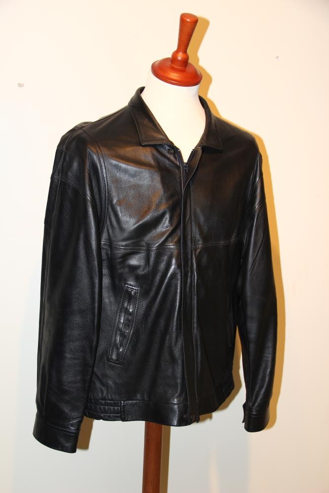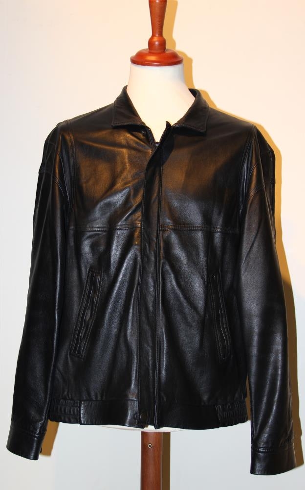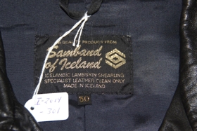 Svartur leðurjakki með rennilás og smellum. Vasar á hliðum og innan á jakkanum. Ísaumað merki: Samband of Iceland. Stærð: 50.