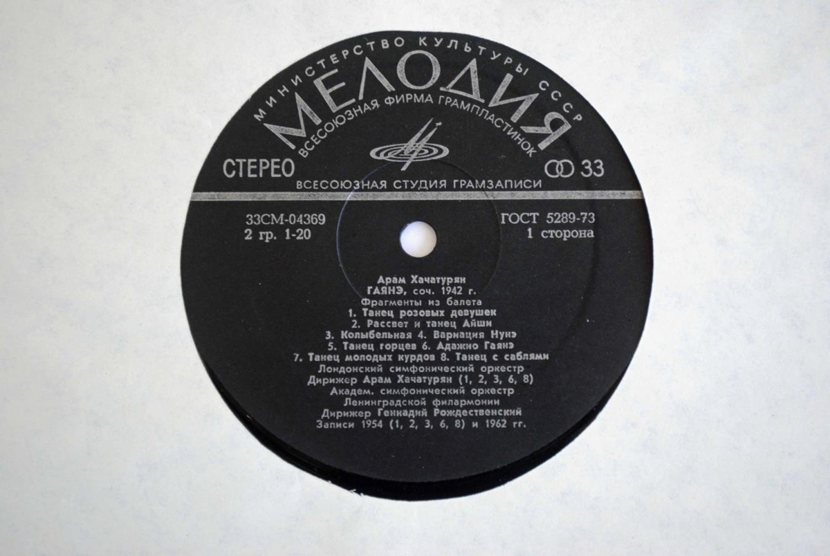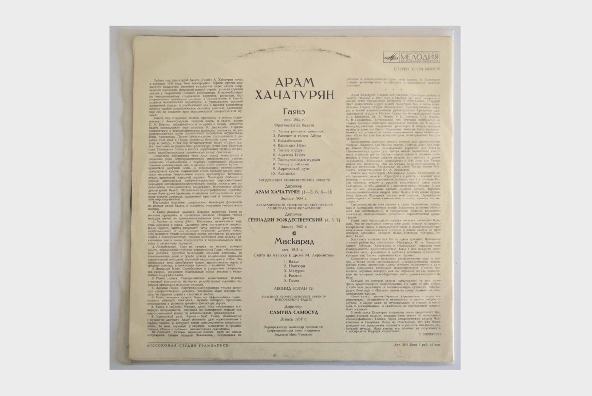 Brot úr Gayane og Masquerade eftir Khachaturian í flutningi Sinfóníuhljómsveitar Lundúna undir stjórn Khachaturian sjálfs, Pílharmóníusveitar Lenígrad undir stjórn Gennady Rozhdestvensky og Bolshoi sinfóníusveitarinnar undir stjórn Samuil Samosud.