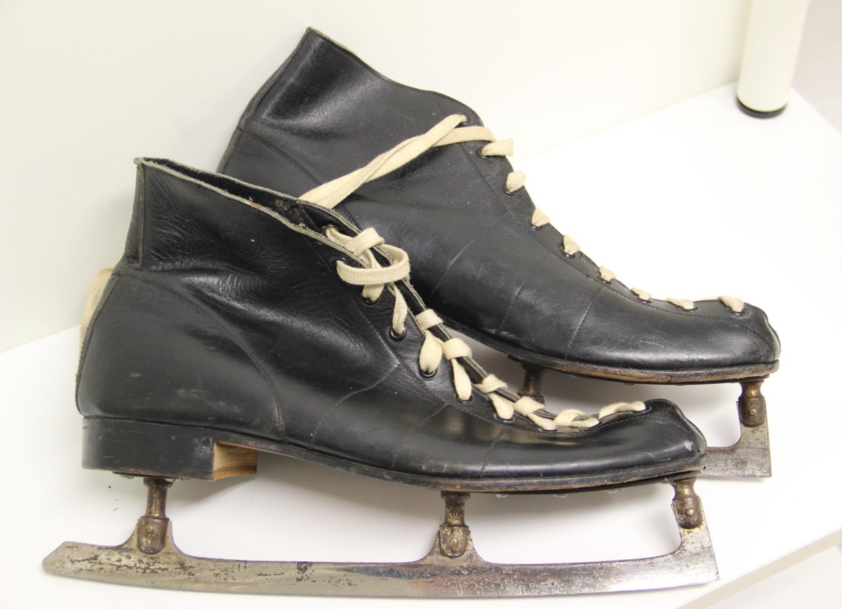 Svartir skautaskór með hvítum reimum. Skautarnir eru í líkingu við hlaupaskauta. Stærð: 44.