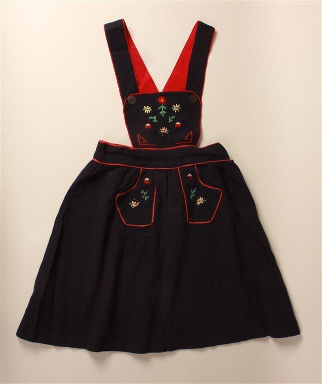 Dökkblár skokkur með smekk og axlarböndum. Pilsið er með tveimur vösum sem eru skreyttir með blómamunstri sem og smekkurinn. Rauðar líningar eru í kringum vasa, streng og smekk.