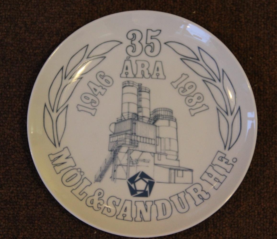 Diskurinn er hvítur með mynd af steypustöð. Texti: 35 ára - 1946-1981 - Möl og sandur.
