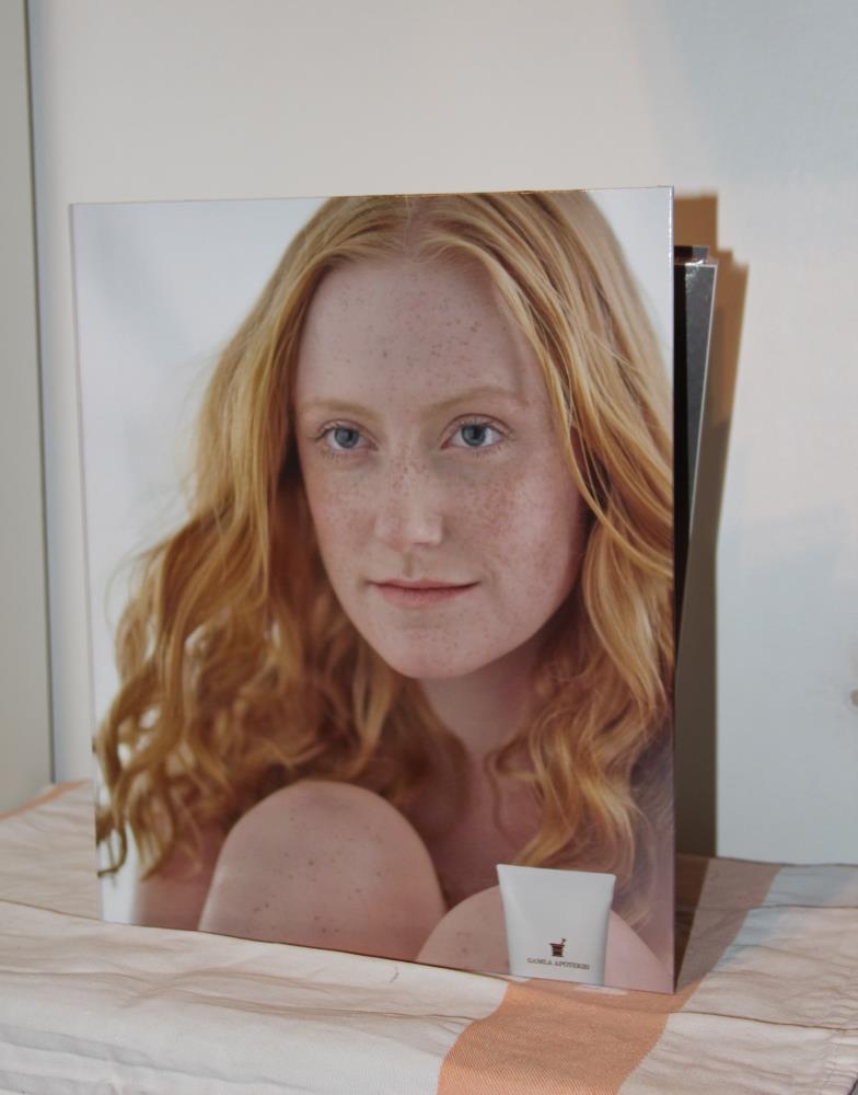 A4 lausblaðamappa, hvít með mynd af konu að framan. Texti á kjöl: Gamla apótekið - vöruupplýsingar.