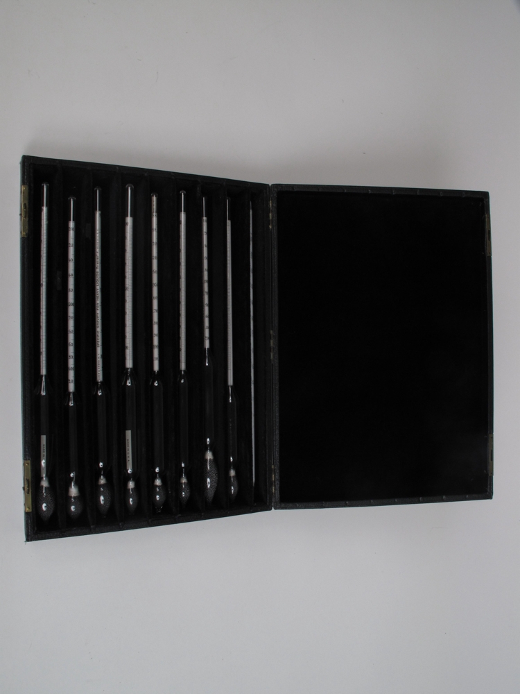 Þorsteinn Þorsteinsson efnafræðingur á Tilraunastöð H.Í. í meinafræði að Keldum, sem afhenti muninn skrifar um hann: Sett af flotvogum frá Eimer & Amend. Frá þessu fyrirtæki var keypt mikið af efnum og tækjum á fyrstu árum stofnunarinnar eftir 1948. Þessar flotvogir hafa verið í umsjá Halldórs Grímssonar og hann hefur notað þær. Þetta eru mjög nákvæm tæki sígild. Nú væri hins vegar notaðar minni flotvogir á rannsóknarstofum svo hægt væri að mæla minni sýni..